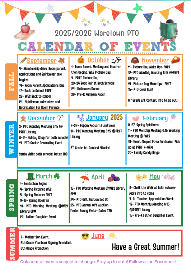 - Waretown PTO Facebook Page – All of our events, programs, and announcements will be on our Facebook and our Class Dojo